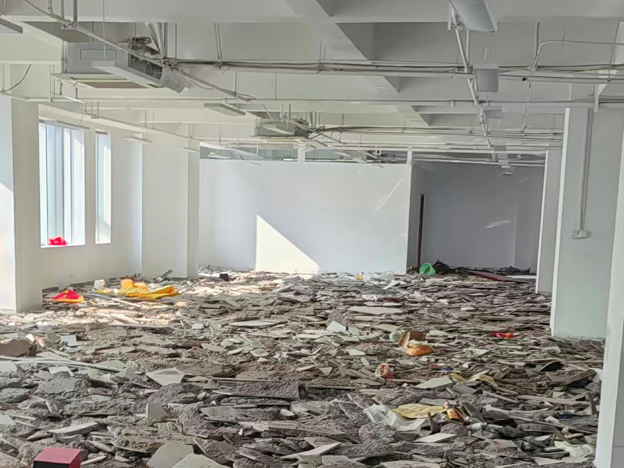 本次建筑拆除项目为大型楼宇内部结构拆除工程,作业范围涵盖楼层内轻质隔墙、非承重构件的系统性破除与清运,项目核心目标为在保障主体结构安全的前提下,完成指定区域的拆除作业,为后续改造施工创造条件。